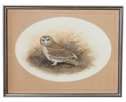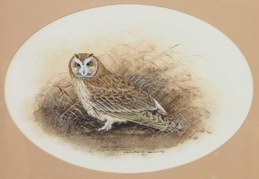 Christopher Scales (British, 20th century), 'Short Eared Owl', gouache and watercolour in oval, 30x42.5cm, signed and dated 1983, framed and glazed.
