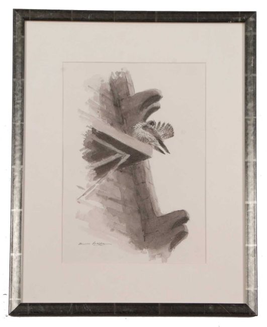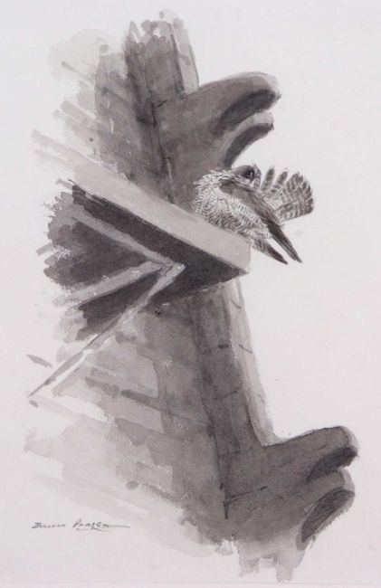 Bruce Pearson (British, 20th/21st century), Perched Peregrine Falcon preens the tail feathers, en grisaille watercolour and pencil, signed, 26x36cm, framed and glazed