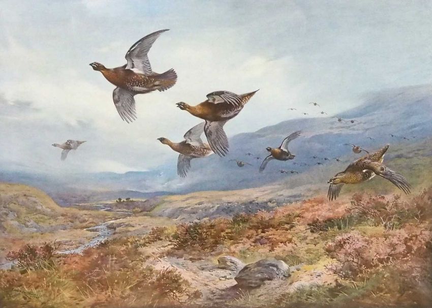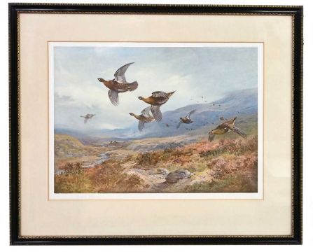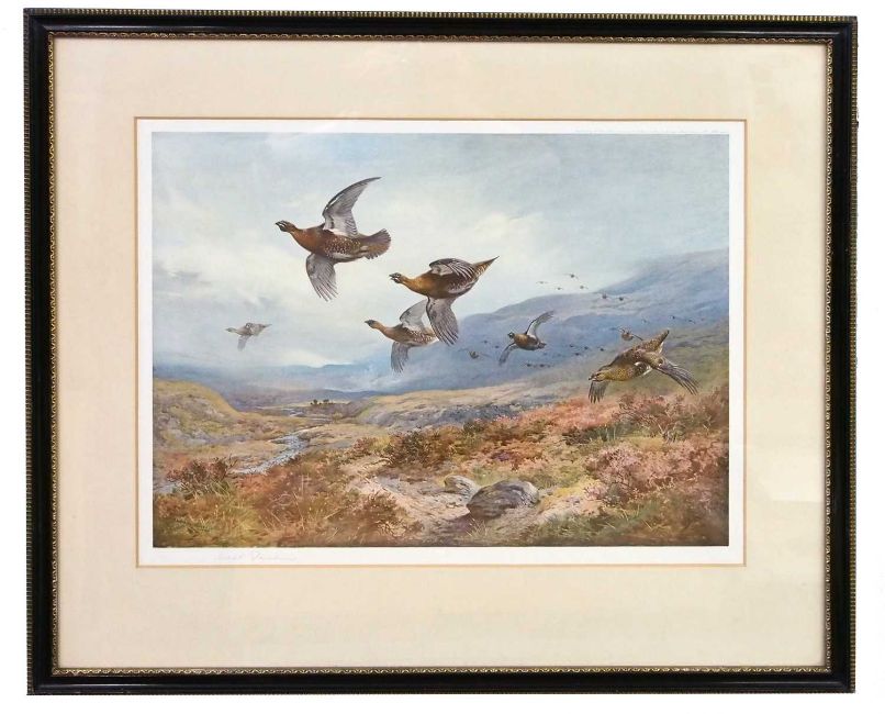 Archibald Thorburn (British,1860-1935), Red Grouse over the burn, collotype artist proof, signed in pencil, 53x41cm, framed and glazed. Tryon Gallery Ltd label on backboard.