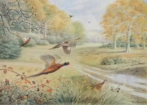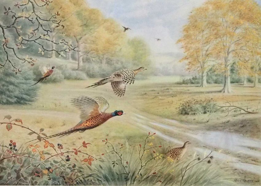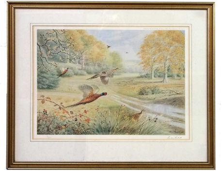 Robin Reckitt (British, b.1928), Pheasants alighting from woodland, limited edition lithograph, numbered (98/500) and signed in pencil, 42x56cm, framed and glazed.