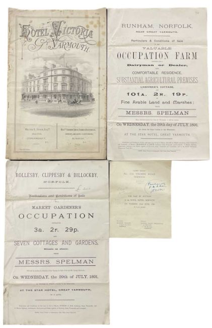 ONE PACKET: Sales particulars for various Norfolk estates: A MARKET GARDENER'S OCCUPATION AND SEVEN COTTAGES AND GARDENS SITUATE IN ROLLESBY, CLIPPESBY AND BILLOCKBY, to be sold at auction by Messrs Spelman on Wednesday 29th July 1891; A VALUABLE OCCUPATION FARM...SUITABLE FOR A DAIRYMAN OR A DEALER, to be sold at auction by Messrs Spelman on Wednesday 29th July 1891; HOTEL VICTORIA - GREAT YARMOUTH, to be sold at auction by Messrs Debenham, Tewson, Farmer and Bridgewater, on Tuesday 10th October 1899; ALDEN HOUSE, 120THORPE ROAD, NORWICH, to be sold at auction by Messrs Hanbury Williams on Tuesday 22nd June 1948.