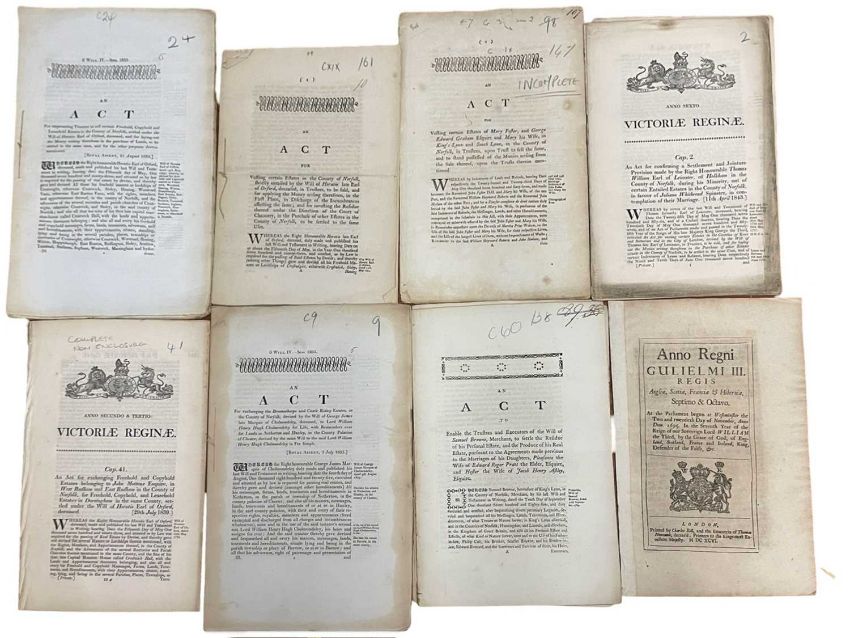ONE PACKET: ANTIQUARIAN PARLIAMENTARY ACTS RELATING TO NORFOLK, to include: Regarding the estate of Horatio, Late Earl of Orford (x2); Regarding the estate of of Mary Foster and George Edward Graham; An act confirming a settlement and jointure provision between Thomas William, Earl of Leicester of Holkham and Juliana Whitbread in contemplation of their marriage; The exchange of the Norfolk estates of George James, late Marquis of Cholmondeley to Lord Henry William Henry Hugh Cholmondeley; Regarding the estate and will of Samuel Browne; The exchange of estates belonging to John Motteux; An act for repairing the high-ways between Wymondham and Attleborough (8)