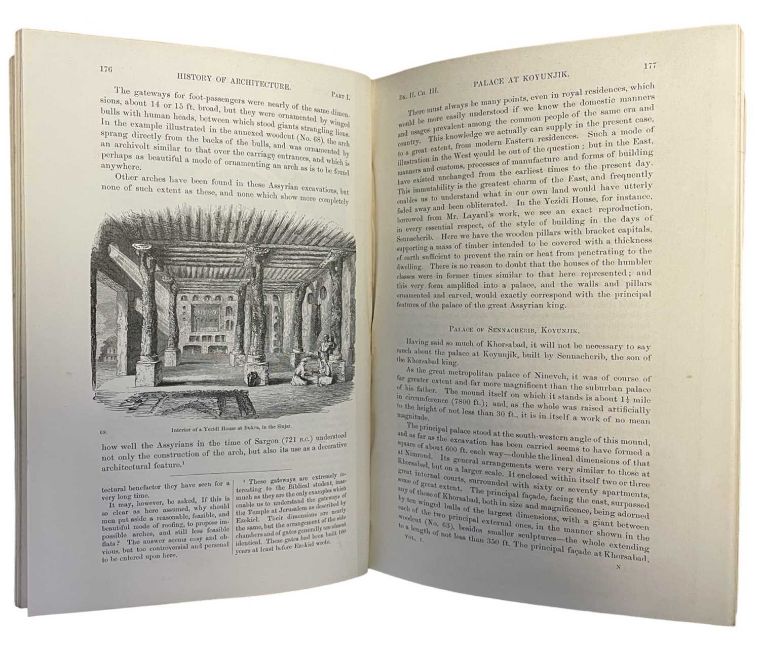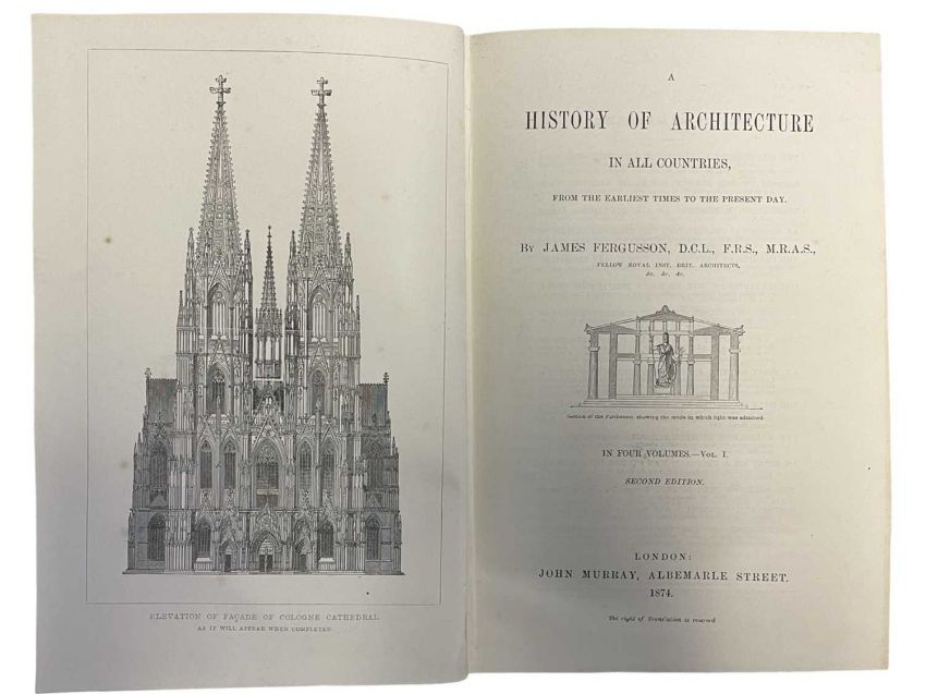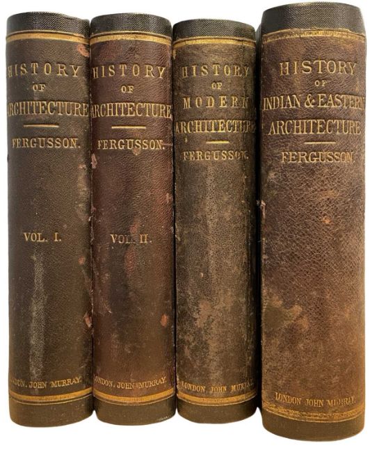 JAMES FERGUSON: HISTORY OF ARCHITECTURE, 4 Titles: A HISTORY OF ARCHITECTURE IN ALL COUNTRIE, Vols 1 and 2, London, John Murray, 1874; HISTORY OF MODERN ARCHITECTURE, London, John Murray, 1862; HISTORY OF INDIAN AND EASTERN ARCHITECTURE, London, John Murray, 1876. All bound in uniform calf spines with gilt titling, uncut edges and numerous black and white illustrations throughout (4)