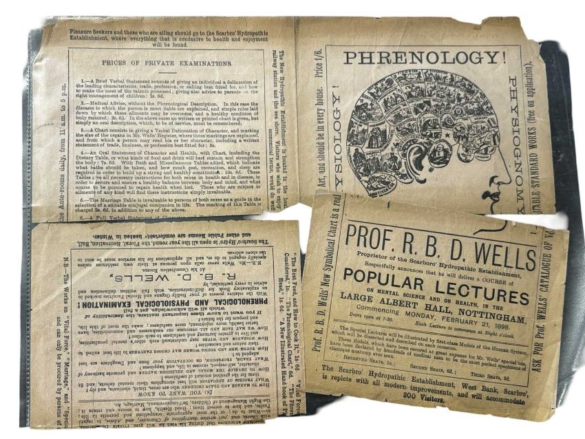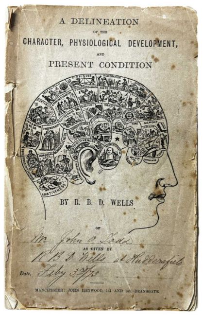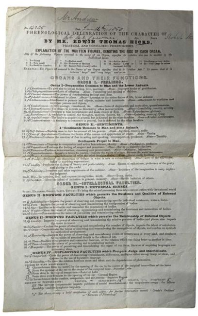 PHRENOLOGY 19th century ephemera, pamphlets and Manuscript Material. Including; The Mental and Physical Development.. As examined by Gustavus Cohen. 1890.On the Relation betweenReligion and Science by George Combe 2nd edition, 1847. A Delineation of the character, physiological development and present condition by R. B. D. Wells. C1873. Phrenological Delineation of the Character of… By Mr Edwain Thomas Hicks. C1850 with manuscript notes from Edwin Thomas Hicks. And other material. A packet.