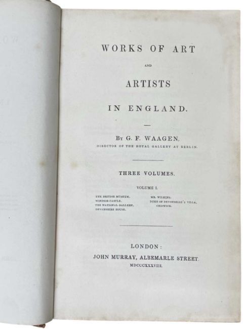 Waagen G F; Works of Art and Artists in England: 3 vols contemporary full tan calf, pub; Murray London 1838, Waagen (1794-1868) was the Director of the Berlin Royal Museum and a respected art historian and connoisseur.