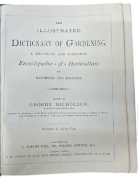 GEORGE NICHOLSON: THE ILLUSTRATED DICTIONARY OF GARDENING in 8 volumes, London, L Upcott and Gill, c1884. Uniformly bound in dark green cloth with black tooled esign to over and gilt title. (8)