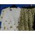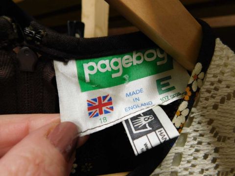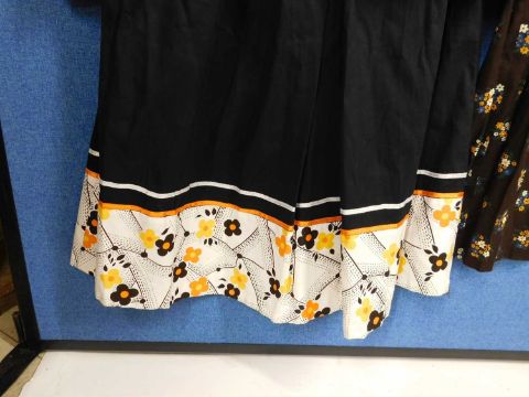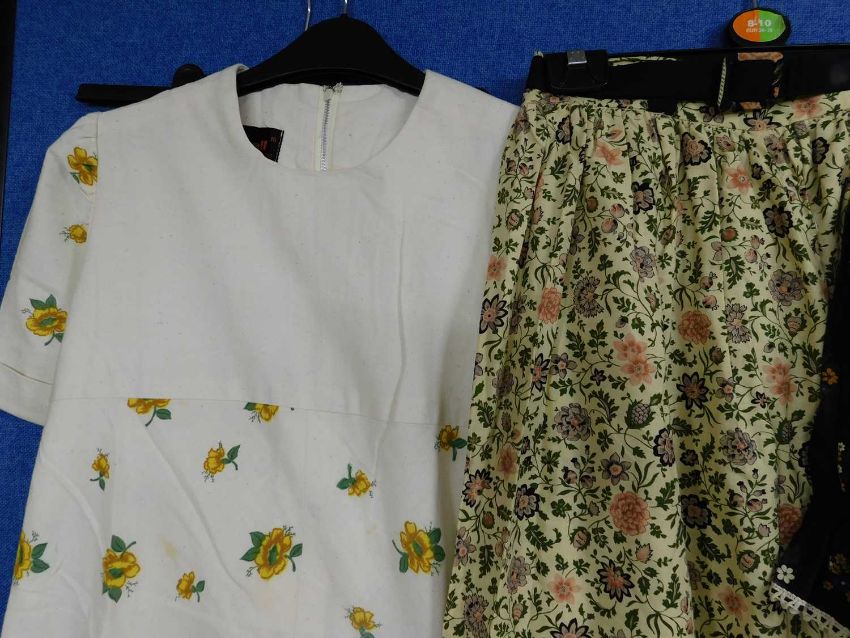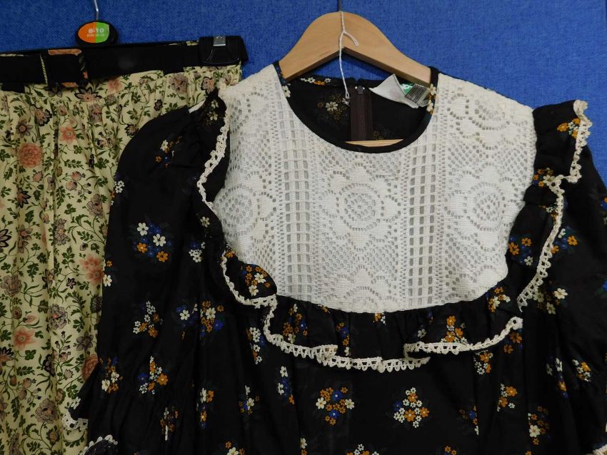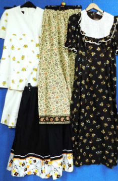 A quantity of circa 1970's lady's wear: to include a brown floral short sleeve full length dress with crochet lace detail, a two piece cream and printed cotton flared tunic and matching trousers by Brimell, size 16, a floral print ankle length skirt with belt and a black and patterned hem skirt (4)