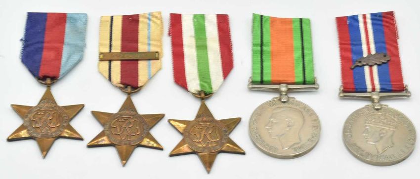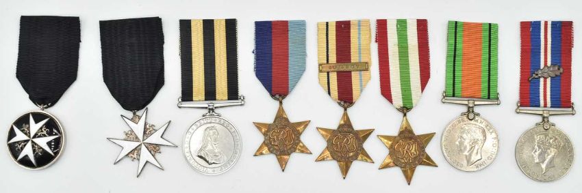 British Order of St. John and Second World War Medal group of eight medals awarded to Gordon Janner Burgess to include Order of St. John officer / serving brother 4th and 6th type, Service Medal to the Order of St.John 1939-45-star, Africa Star with 8th Army clasp, Italy Star, Defence Medal, and 1939-45 war medal with Mention in Despatches oak leaf.