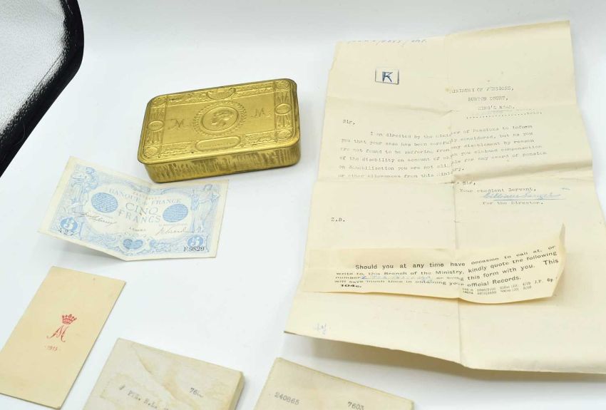 First World War 1914 Queen Marys Christmas Tin, 1915 Christmas card, 1916 French bank note together with pair of First World War British Medals to include 1914-18 War Medal and 1914-19 Victory Medal impressed to 240865 Pte. R.L. Bane, The Queens Regiment