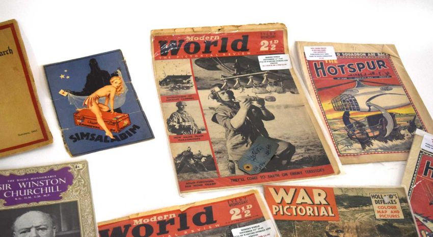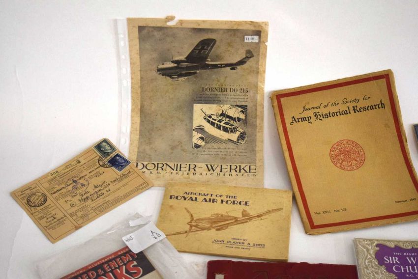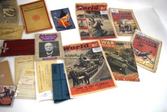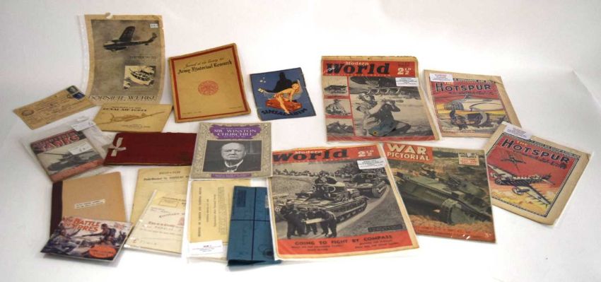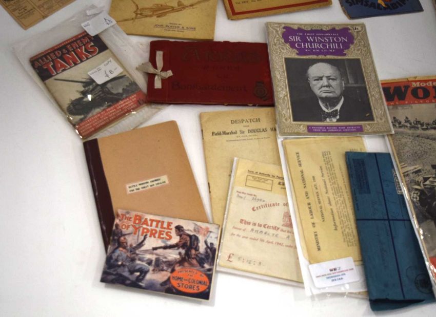 Quantity of mixed First World War, Second World War and Post War ephemera to include: Hutchinson's illustrated record of Allied & Enemy tanks, John Players ciggerette cards of Aircraft of the Royal Airforce, Dispatch from Field Marshal Sir douglas haig covering the period from 8th December 1917 - 30th April 1918 (Published 1918), Battle honours awarded for the Great War 1914-18, souviner photobook of the bombardment of Arras, Post War National Service documents, Pictorial record with extracts from the speeches of Winston churchil, Journal of the society for army historical research - summer issue 1947, The Battle of Ypres presented by Home and Colonial stores, documentation of Dornier Werke of the Dornier DO 215 aircraft, American WW2 Simsalabim magic show programme, Thrid reich 1944 dated parcel / package postal reciept, copy of Hotspur magazine, War Pictorial, Modern world magazines