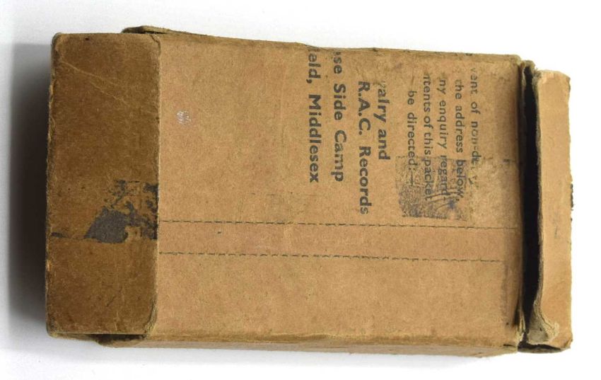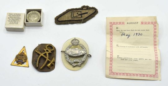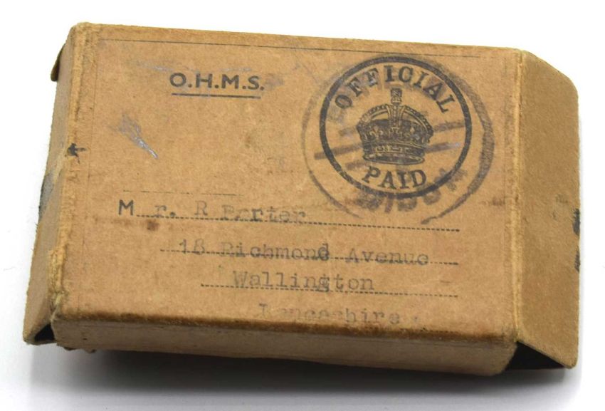Second World War medal group of three medals comprising of 1939-45 star, Defence Medal and 1939-45 Medal with medal card and original cardboard box to Mr. R. Porter of 18 Richmond Avenue, Wallington Lancashire, together with Armoured corps insignia tank patch and further 'For Loyal Service' ministry of pension kings Button Hole badge etc