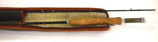 Peregrine three section cork handled Fly fishing rod 9'6" #6/7 rod No.1176 - T.A, 25 in rod bag and leather and canvas rod slip