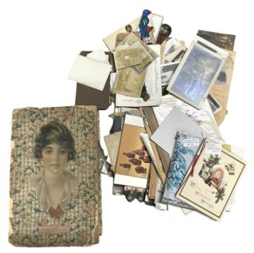 Ephemera. An early 20th century cardboard box with “Fry’s Rambler Chocolates” ti the front board in colour [rdetahed] The box filled with Col litho Die-cuts, greetings cards, photos, postcards and other ephemera [20th to late 19th].