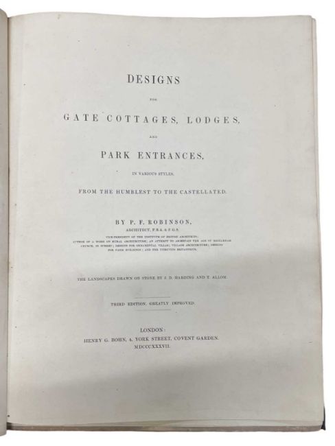 Designs for gate cottages, lodges, and park entrances, in various styles, from the humblest to the castellated. Third edition, greatly improved. 1837. P. F. Robinson. With all 48 Engraved and litho plates as called for, prelims to the front. Large 4to [31.5cm x 24.8cm. Period quarter Morocco, with Morocco title label in gilt to upper board, some foxing and discolouration to the plates.