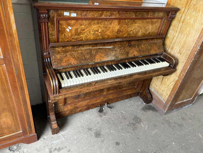 A Gilbert of London walnut cased piano with simulated ivory keys