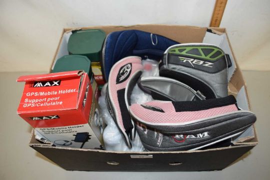 Box of golf balls, golf tees, club covers etc