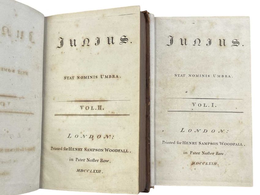 Junius Stat Nominees Umbra. London: printed for Henry Sampson Woodfall... 1772. Early issue, with the Table of Contents and Index sections. 2 Vol. 12mo. Both volumes bound in period calf, Morocco titles in gilt to the spine gilt bands. **In 1772 under the pseudonym of "Junius" (possibly Sir Philip Francis). "...'Junius' poured brilliantly slanderous invective upon Tory-minded English ministers, especially the Duke of Grafton, for a series of 'inconsistent measures' which allegedly ruined England and drove the colonies 'into excesses little short of rebellion.'