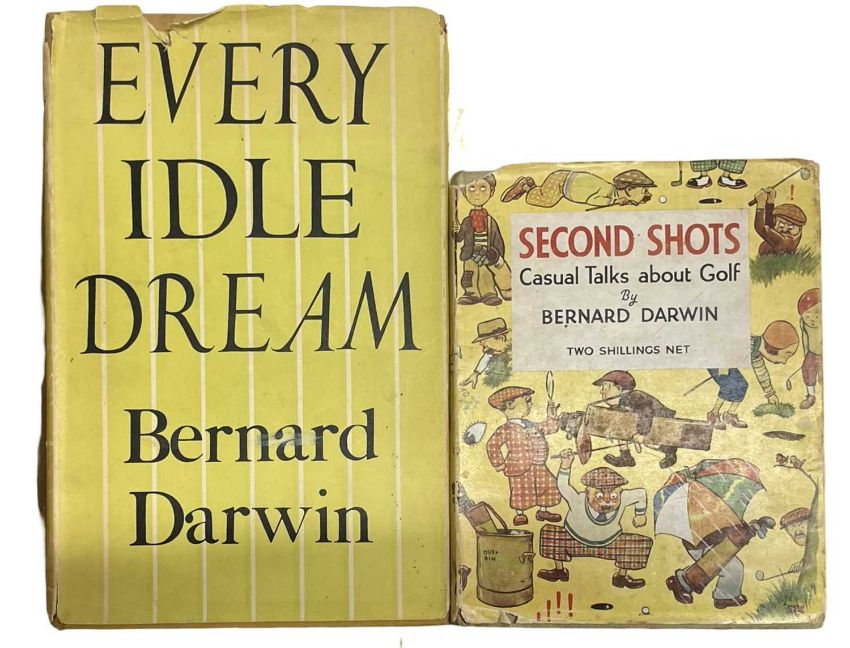 DARWIN [Bernard]. Two titles which include Second Shots, Casual Talks about Golf. 1930 London George Newness. Hard back with black titles to the upper board and spine, with unclipped dust jacket. With half title, lacking bank FFEP. With monochrome frontispiece, some foxing. With Every Idle Dream 1948 Collins St James Place London. 1948. With unclipped dust jacket. Yellow cloth, top edges discoloured. Some tears to the jacket. [2]