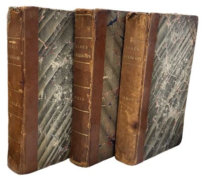 ASTRONOMY The Times Telescope. 1825, 1827, 1830. Three volumes. Bound in period half calf. Small 8vo. With engraved frontispieces, occasional illustrations. Astronomy Almanack. Some wear to the bindings, staining to the 1827 edition. [3]