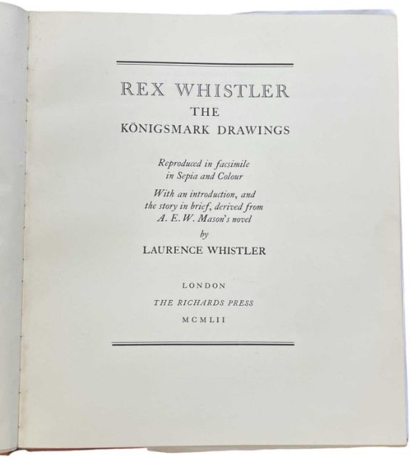 WHISTLER [Rex]. Rex Whistler The Konigsmark Drawings. By Laurence Whistler, London The Richards Press. 1952. Slim folio, Limited Edition #870 of 950. With clipped dust jacket [dust marked and torn], original red cloth in gilt. Tipped in plates and 3 others regarding Whistler [4]