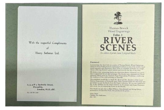 Bewick (Thomas, 1753-1828). Thomas Bewick Wood Engravings, Folio 3, an edition of prints from 5 original blocks, Newcastle upon Tyne, Charlotte Press/Northern Publishing Workshop, 1981, five wood engravings on hand-made paper, published in an edition of 500 copies, each numbered 398/500 in pencil, loose in original printed wrappers, with original printed envelope.
