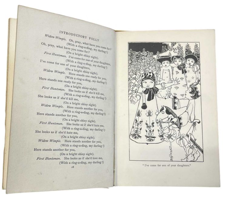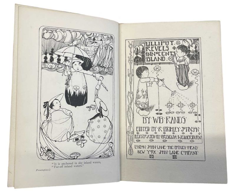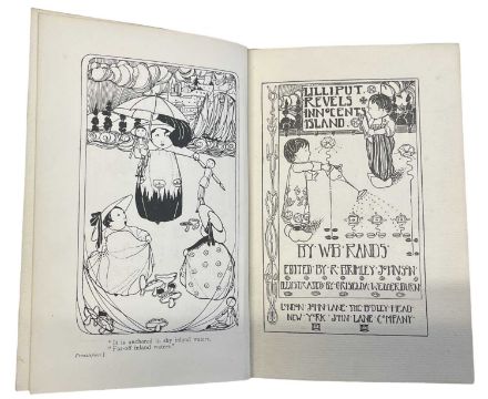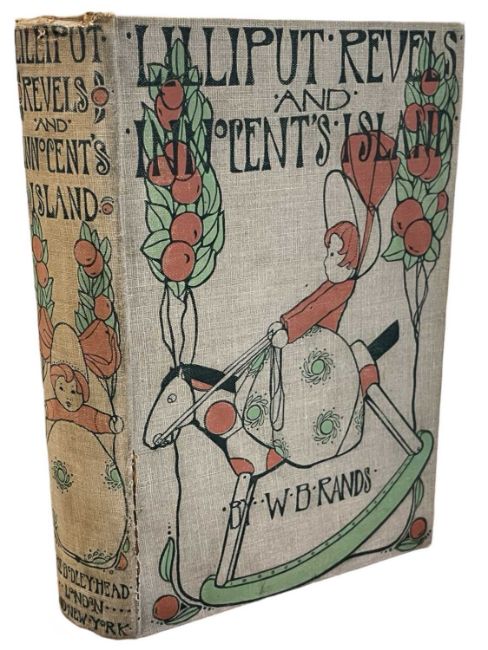 ART NOUVEAU BINDING. Lilliput Revels + Innocents Islands. c1905. [worldcat]. By W.B. Rands. Edited by R. Brimley Johnson and illustrated by Griselda Wedderburn. Beautifully bound in the original [?] Art Nouveau style decorated binding in black, green and red. 8vo. All page edges dyed green. Half title, frontispiece, illustrated title, and a further 31 plates. Rare. With no auction results, or other copies for sale. Thin worn trail to the front boards lower joint. Some discolouration to the spine. Light marks to the back board.