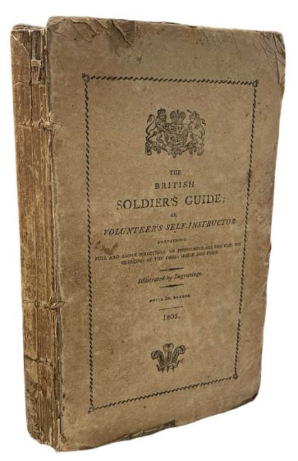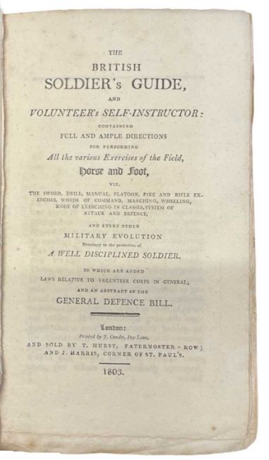 The British Soldier's Guide, and Volunteer's Self-Instructor: Containing Full and Ample Directions for Performing all the Various Exercises of the Field, Horse and Foot, viz. the Sword, Drill, Manual..., and Every other Military Evolution Necessary to the Perfection of a Well Disciplined Soldier. To which are added Laws Relative to Volunteer Corps in General; and an Abstract of the General Defence Bill, printed by J. Cundee, and sold by T. Hurst and J. Harris, 1803, [3], iv-xiv, 226, 24pp. With all 12 engraved plates, but lacking the engraved frontispiece. In publishers original boards. Some wear to the binding, rubbed/ scuffed, paper chipping to the edges. Paper wearing from spine, front board stat he’d by cords only, Thomas Francis Fremantle bookplate to the front pastedown. **THOMAS FRANCIS FREMANTLE; Vice-Admiral Sir Thomas Francis Fremantle, 1st Baron Fremantle, Bt GCB GCH (20 November 1765 – 19 December 1819) was a British Royal Navy officer and nobleman whose accolades include three separate fleet actions, a close friendship with Horatio Nelson, 1st Viscount Nelson and being granted an Austrian barony. He was the father of Admiral Sir Charles Fremantle, after whom the city Fremantle in Western Australia is named from ***Rare in commerce.