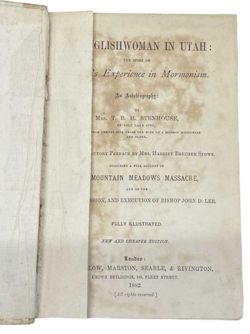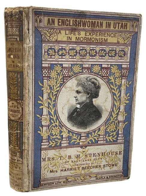 An Englishwoman in Utah; The story of A Life’s Experience in Mormonism. An Autobiography; By Mrs T. B. H. Stenhouse, of sale lake city. With an introductory preface by Mrs Harriet Beecher Stowe. Including a full account of The Mountain Meadows massacre. 1882. London Sampson Low. Marston. In the publishers original decorative binding. The paper to the joint’s chipped, some rubbing lacking FFEP, title browned, [7], viii-xii, 404pp with all 14 illustrations on 9 plates.**An Englishwoman in Utah is regarded as one of Arthur Conan Doyle's sources for the first Sherlock Holmes novel, A Study in Scarlet, published in 1886, which featured an unflattering depiction of the faith.