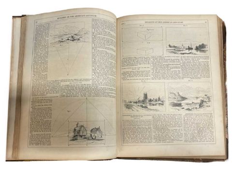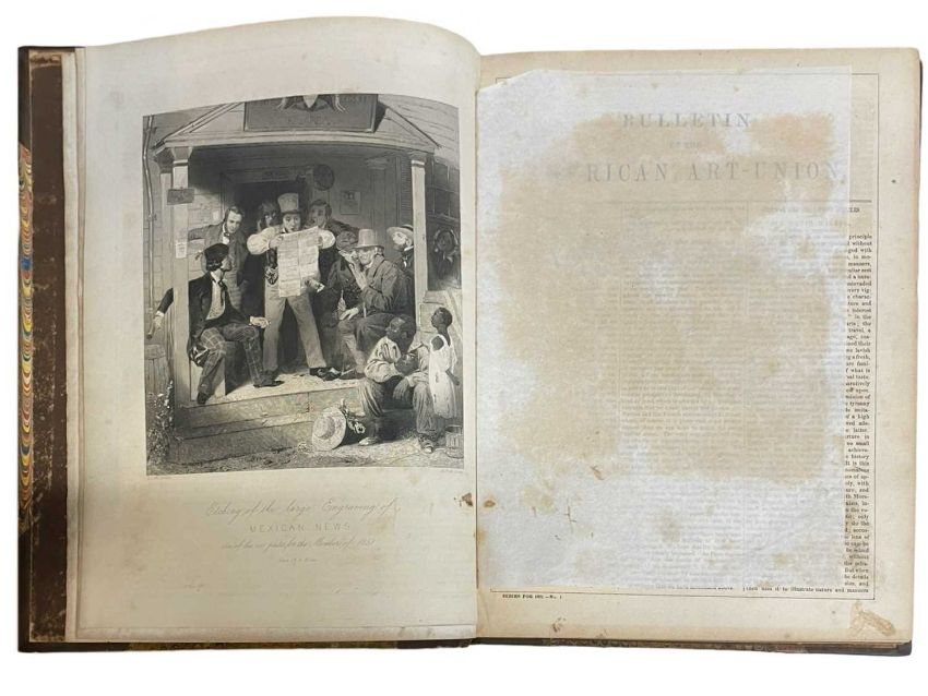 Bulletin of the American Art-Union. New York. 1851 April to December. Small folio. Bound in period half calf, black Morocco title label in gilt to the spine. 154, 8, [7]pp. With 12 Engraved plates [some in line]. In text illustrations throughout.Some browning and foxing throughout. Rubbing and scuffing to the binding. American Art, Culture periodical. Scarce.