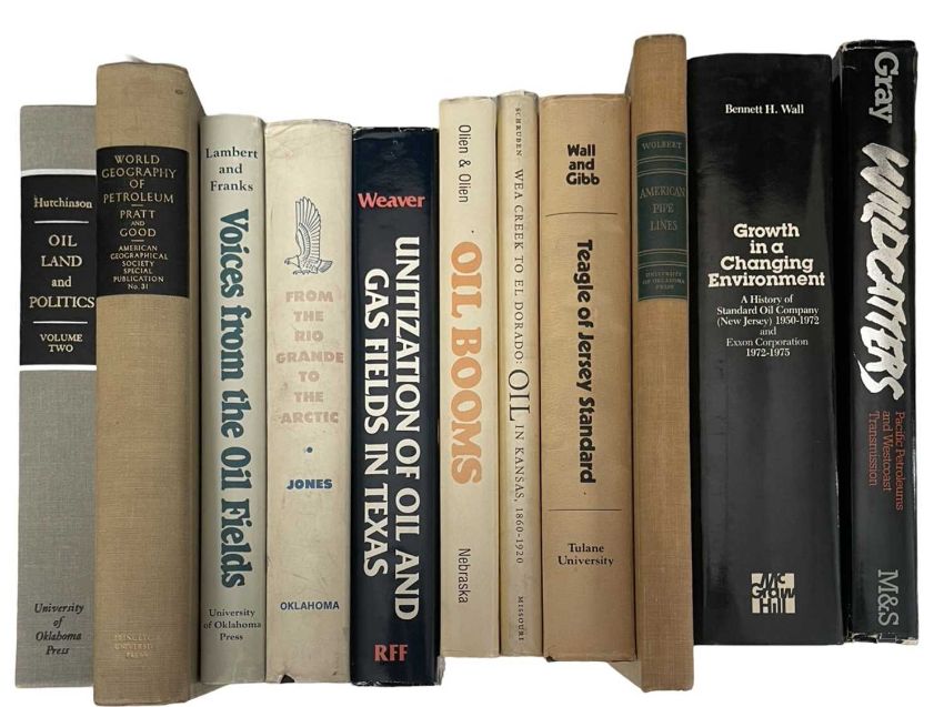 OIL & ECONOMY INTEREST. A small collection of 11 volumes. Including; World Geography of Petroleum, Edited by Wallace E. Pratt, 1950, American Geographical Society, by Princeton University Press. Voices from the Oil Fields, Paul F. Lambert. 1984 with unclipped dust jacket. Unitization of Oil and Gas Fields in Texas. Jacqueline Lang Weaver. Washington D.C. 1986. Wildcatters, The Story of Pacific Petroleums and Westcoast Transmission. McClelland and Stewart. 1982. And others [11].