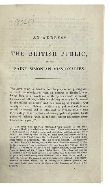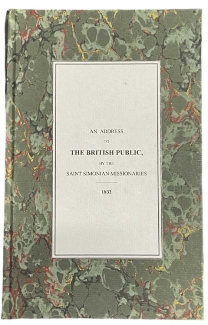 1832[?] An Address to the British Public by the Saint Simonian Missionaries [Drop title]. Slim 8vo. Bound in modern marbled boards. 36pp. Signed [in print] by Charles Duveyrier. **Rare. Only two copies registered on Worldcat [British Library and V&A]. No auction results. Charles Duveyrier (12 April 1803 – 10 November 1866) was a French playwright and Saint-Simonianism ideologist, born on April 12, 1803, in Paris, where he died on November 10, 1866. Rare bound pamphlet.