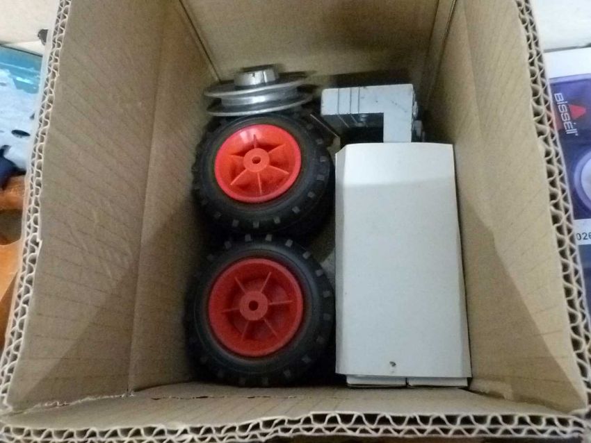 Box of mixed items to include small implement wheels, boxes of wall plugs etc