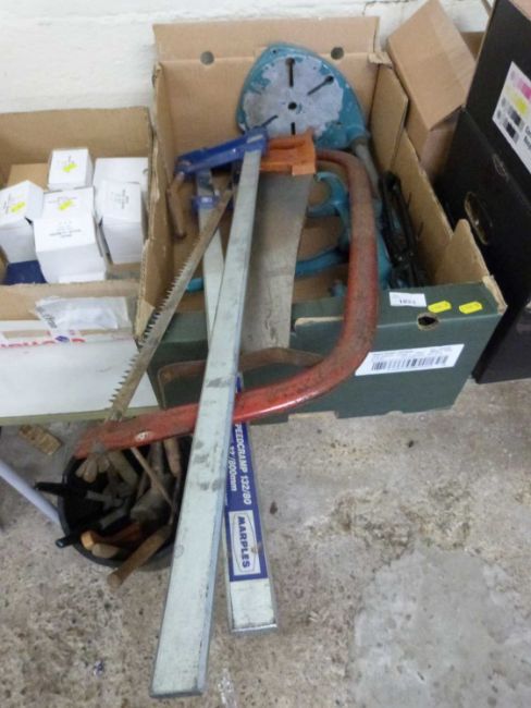 Pillar drill stand, wood clamps, saw etc