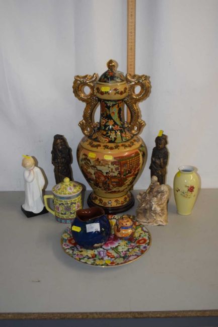 Mixed Lot: A large reproduction Chinese vase with dragon handles, together with further items to include Royal Doulton figurine Darling and other assorted ceramics and ornaments