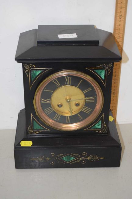 Late Victorian black slate cased mantel clock with brass movement striking on a coiled gong