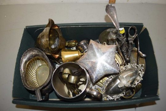 Box of various assorted silver plated items, brass wares etc