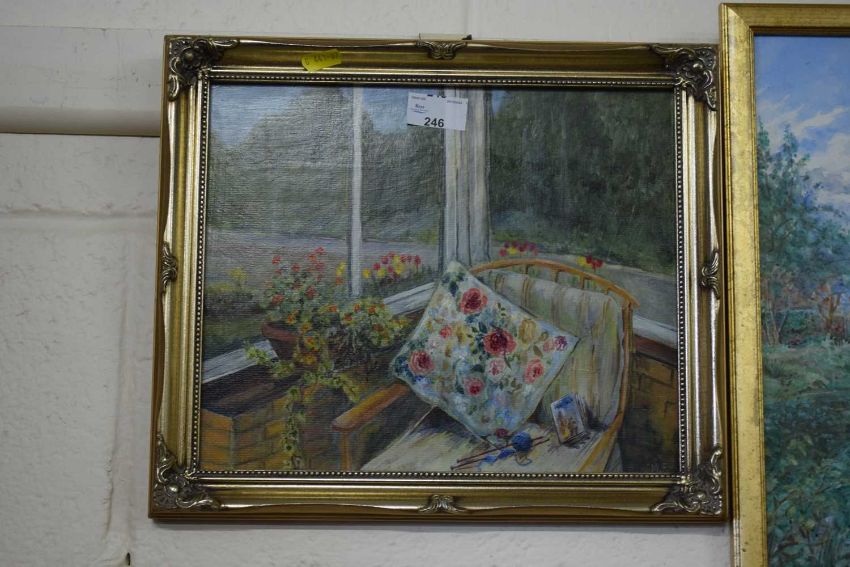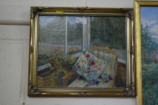 20th Century school study of an interior scene, oil on board, initialled MF