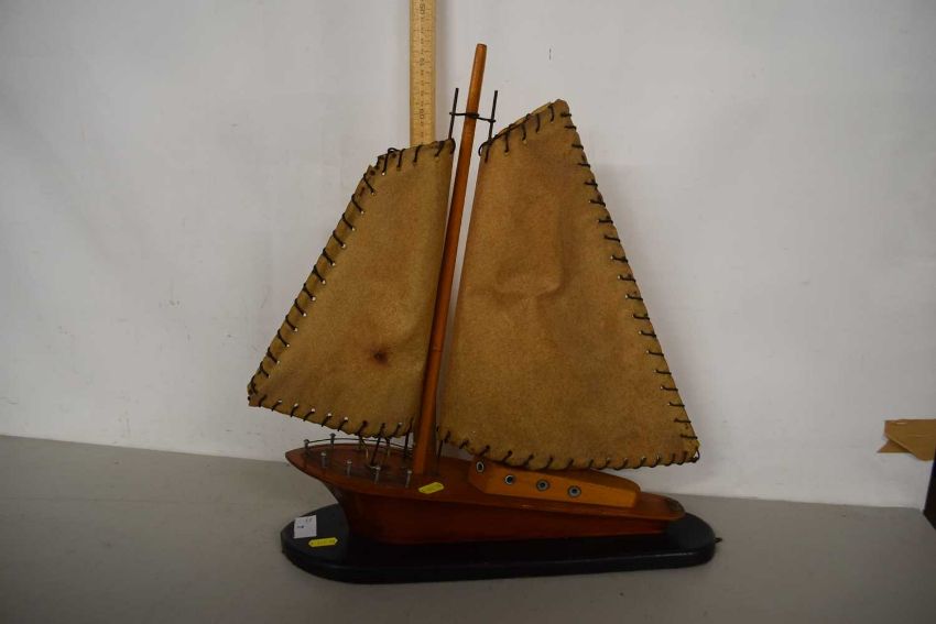 A wooden model of a yacht on black oval plinth