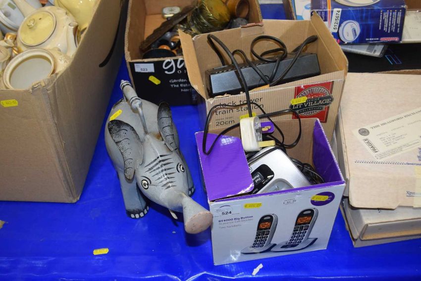 Quantity of mixed wares to include alarm clock, telephone, ceramic model of a clock tower train station and tin metal painted elephant watering can