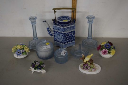 Various ceramic and glass items including Royal Adderley flowers, tea kettle with blue and white design etc