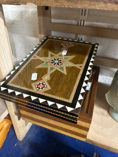 A hardwood chess set together with a modern inlaid backgammon board