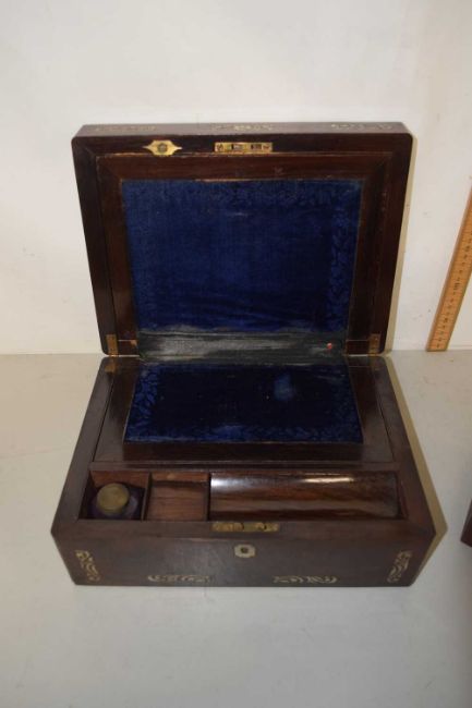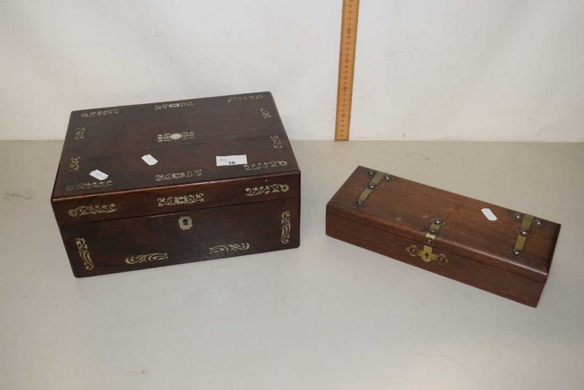 Victorian mother of pearl inlaid writing box together with a further metal bound oak box